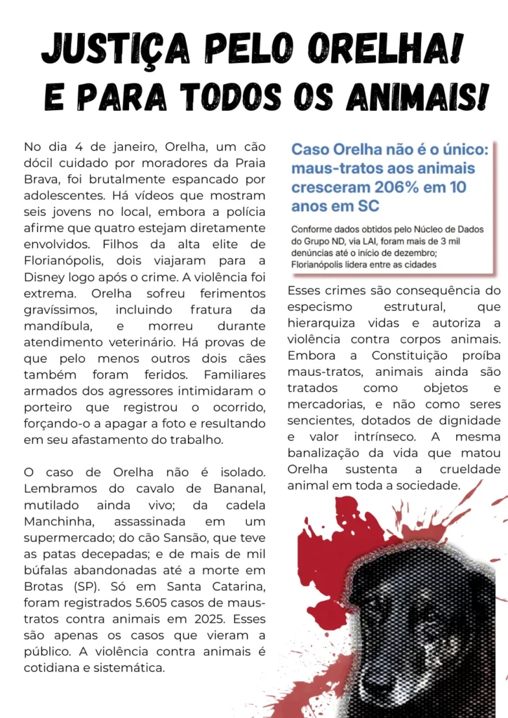 O que aconteceu com Orelha não é um caso isolado. É importante lembrar de episódios recentes como o cavalo de Bananal, que teve as quatro patas cortadas ainda vivo por seu “tutor”; a cadela Manchinha, assassinada em um supermercado em Osasco; o cão Sansão, que teve as duas patas traseiras decepadas; e mais de mil búfalas deixadas para morrer de fome e sede em uma fazenda em Brotas, no interior de São Paulo. Apenas no estado de Santa Catarina foram registrados 5.605 casos de maus-tratos contra animais em 2025. Esses são apenas alguns dos casos que ganharam notoriedade ou foram denunciados. Animais são brutalmente feridos, abusados, mutilados, explorados e assassinados todos os dias, e precisamos falar sobre isso.