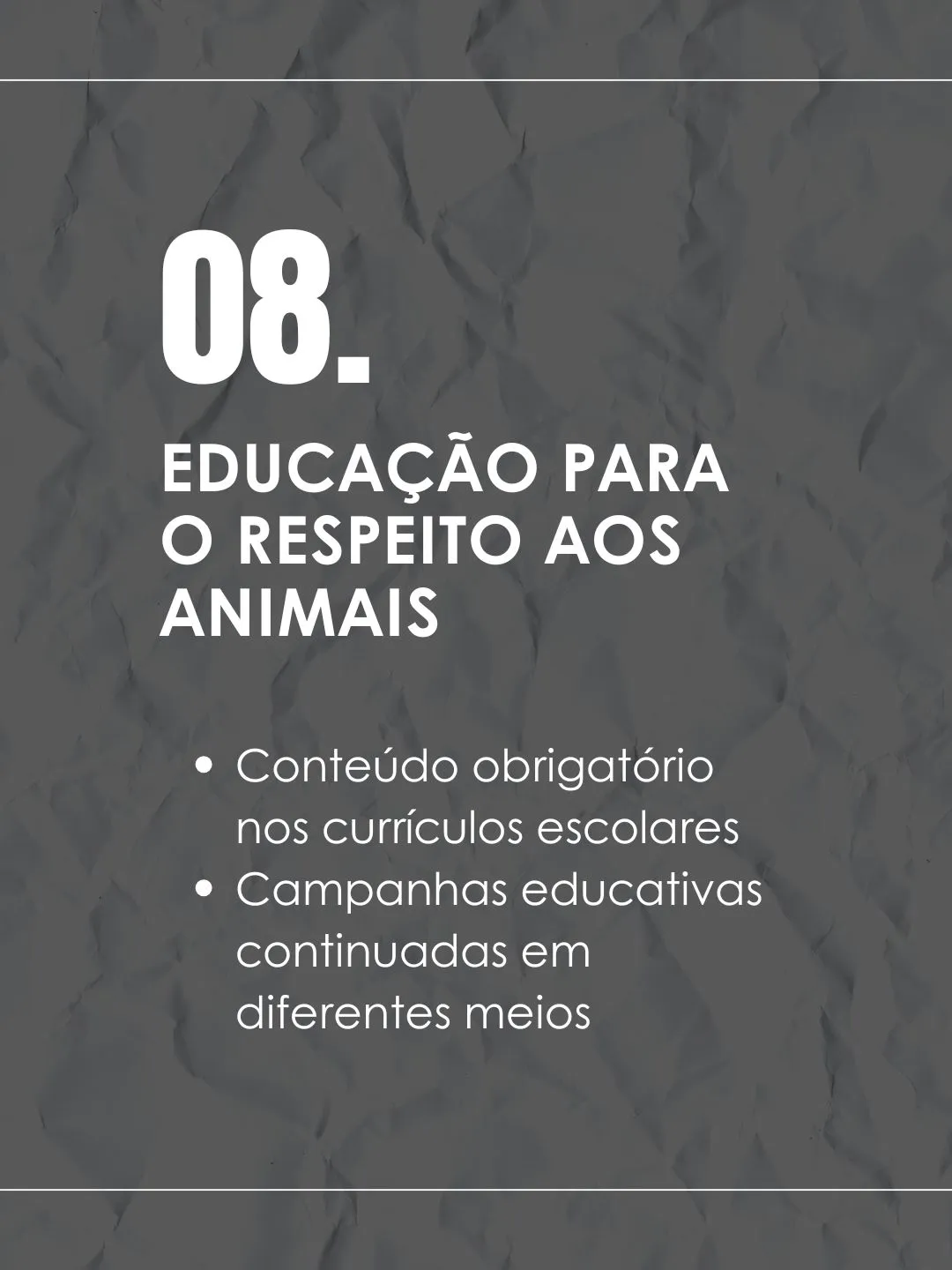 8. Inclusão, no âmbito dos currículos escolares, da abordagem transversal e interdisciplinar de conteúdos relacionados ao respeito aos animais, à proteção de seus direitos e à prevenção da crueldade contra animais, acompanhada da implementação de campanhas educativas obrigatórias e contínuas de conscientização dirigidas à comunidade escolar e à sociedade.