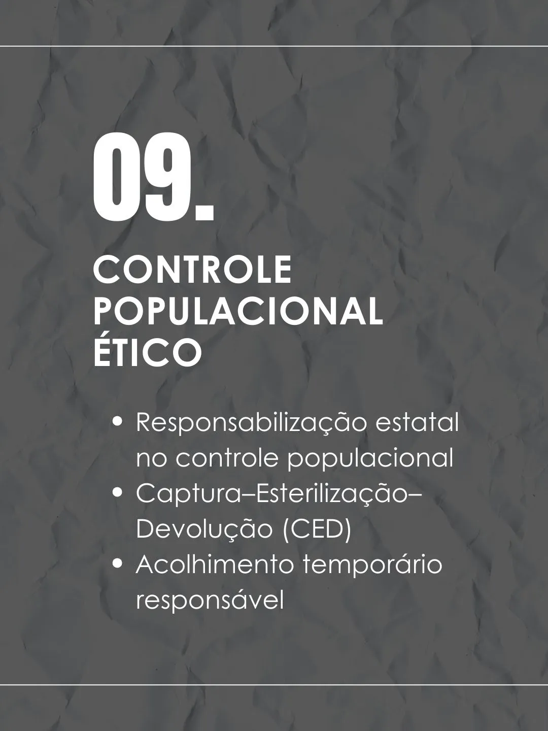 9. No campo administrativo, instituição de política pública permanente de controle populacional de animais, por meio de programas de captura, esterilização cirúrgica, acolhimento temporário para recuperação pós-operatória e posterior devolução ao local de origem, no modelo de captura–esterilização–devolução (CED), asseguradas as condições sanitárias e de bem-estar animal.