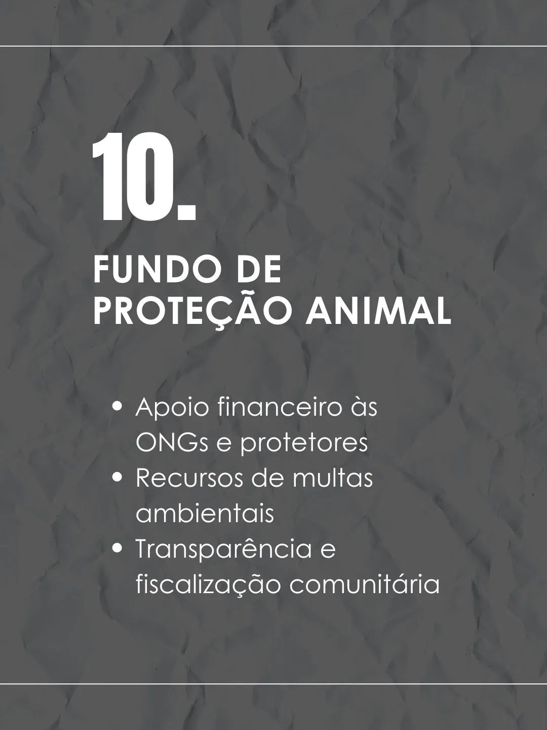 10. Apoio financeiro às ONGs e aos protetores devidamente comprovados como cuidadores de animais de estimação em situação de vulnerabilidade, com mecanismos de controle social, como a criação de conselhos comunitários para fiscalização participativa desses locais. Esse apoio deve ocorrer por meio da instituição de um Fundo de Proteção Animal, abastecido por recursos provenientes de multas por crimes ambientais e por um orçamento mínimo obrigatório dos governos federal, estadual e municipal, garantindo transparência, continuidade e efetividade na proteção animal.