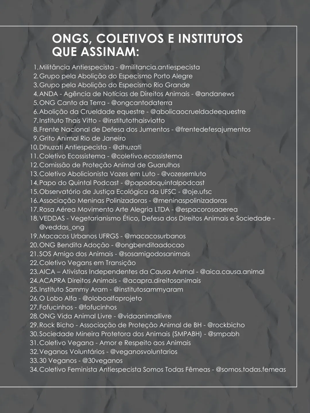 As ONGs, coletivos e institutos abaixo, com o objetivo de intervir de forma qualificada no debate público desencadeado pelo crime cometido contra o cão Orelha, sistematizaram dez reivindicações principais: