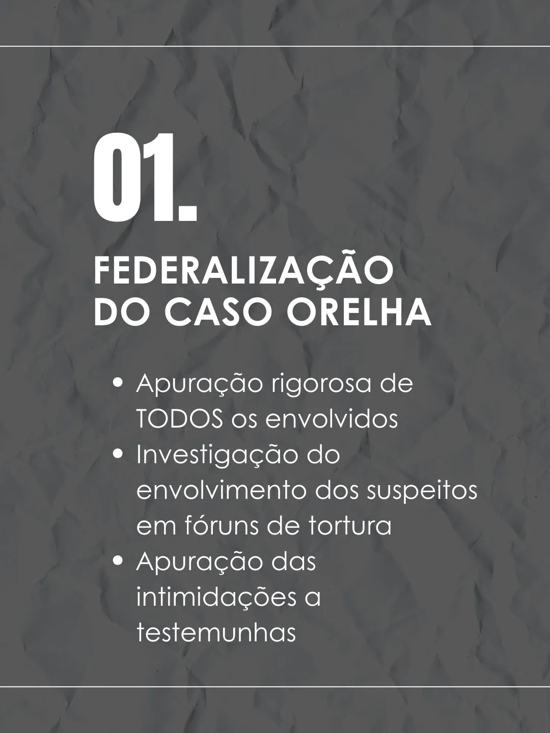 1. Federalização para apuração policial rigorosa de todos os suspeitos de envolvimento no caso do Orelha (incluindo o histórico de agressão e envolvimento com crimes cibernéticos de tortura), responsabilização de TODOS os envolvidos e investigação das tentativas de intimidação.