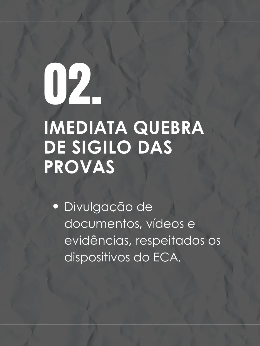 2. A quebra de sigilo imediata de todos os documentos, vídeos e provas, preservada, de acordo com o ECA, a identidade dos adolescentes. (Dentro desses limites, ela não só é legal, como deve ser determinada pela Justiça para garantir a ordem pública e a efetividade da investigação, impedir coação de testemunhas e interferência no andamento da apuração por indivíduos com poder econômico e político. O sigilo nestas circunstâncias compromete a investigação e favorece a impunidade, sem garantir proteção legal dos envolvidos).