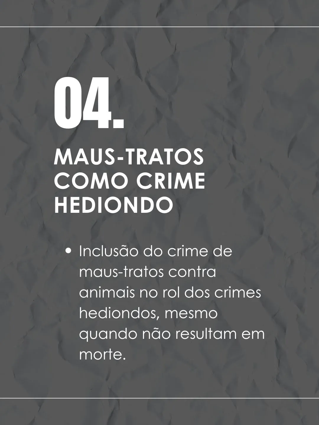 4. No campo jurídico, reconhecimento do crime de maus-tratos contra animais, devidamente tipificado na legislação penal, como crime hediondo. (Embora já exista iniciativa legislativa nesse sentido — a exemplo do Projeto de Lei nº 2.475/2025 —, sua redação limita a classificação como hediondo exclusivamente às hipóteses em que a conduta resulte na morte do animal).