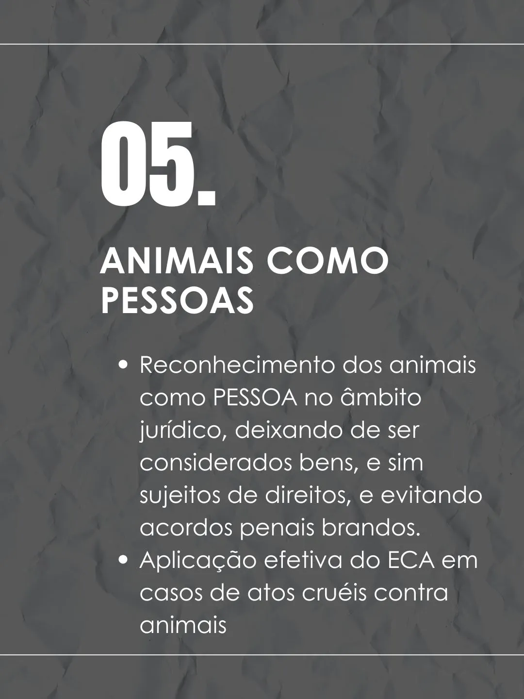 5. Reconhecimento dos animais como pessoas, a fim de equipará-los aos animais humanos, retirando-os do regime jurídico de bens, haja vista que pessoa é um conceito jurídico que não se restringe apenas a vida humana, prova disso, são as pessoas jurídicas. Estender o conceito de pessoa aos animais, possibilitará que nos crimes de maus tratos aos animais estes possam ser vítimas e não a sociedade, além de possibilitar que  o crime de maus tratos aos animais sejam considerados GRAVES, pois são praticados com violência e grave ameaça; Desta forma, não será passível de acordo de não persecução penal e para aplicação das medidas socioeducativas de internação e de semi liberdade previstas no Estatuto da Criança e do Adolescente (ECA), já que atualmente, a medida de internação e semi liberdade encontra-se restrita a atos infracionais análogos a crimes cometidos mediante grave ameaça ou violência contra a PESSOA HUMANA, não abrangendo, portanto, os casos de maus-tratos e crueldade contra ANIMAIS.