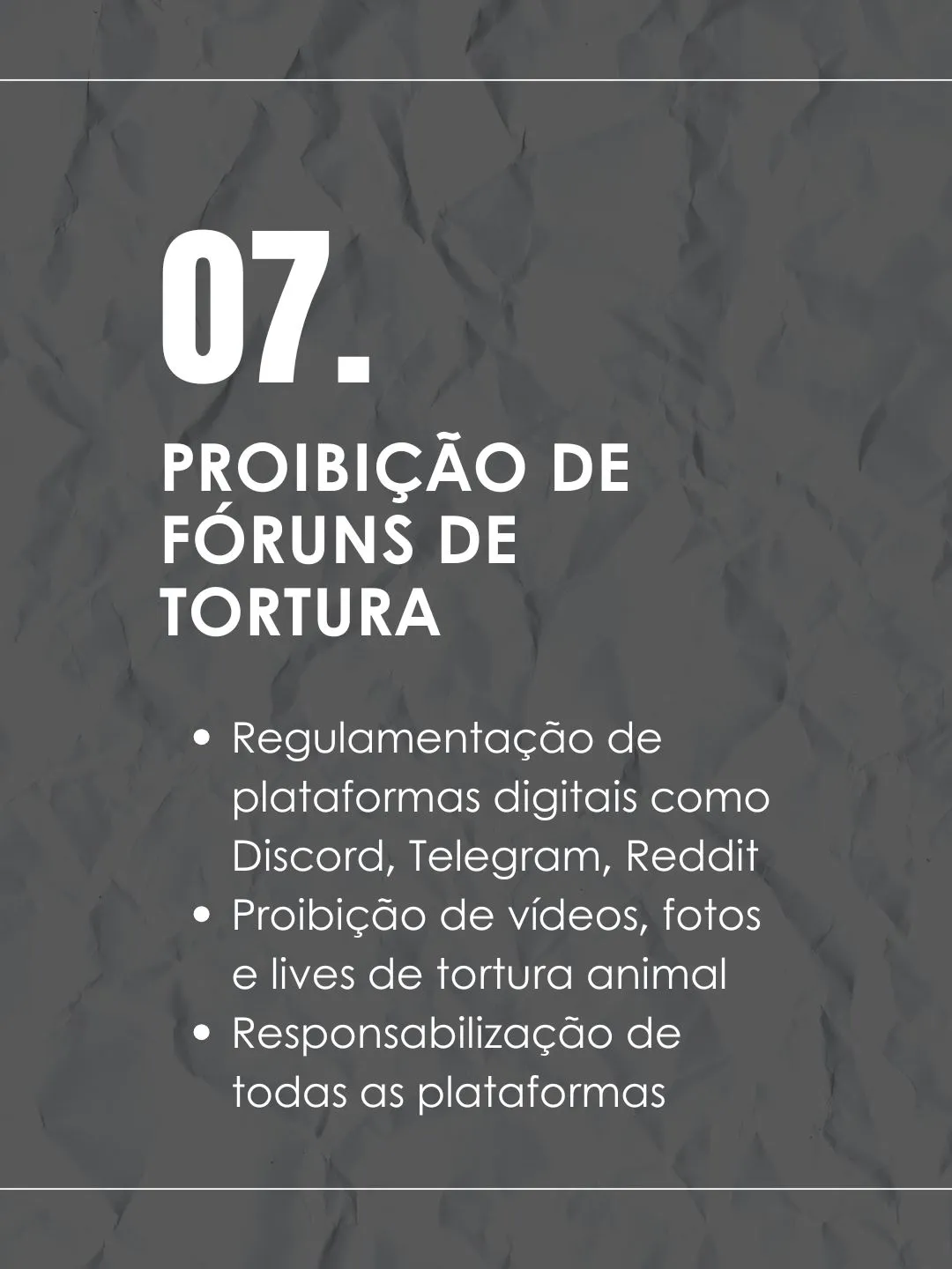 7. Regulamentação urgente das plataformas, das big techs e demais fóruns (como o Discord, Reddit e Telegram) para a proibição de veiculação de vídeos, fotos e lives de tortura animal online.