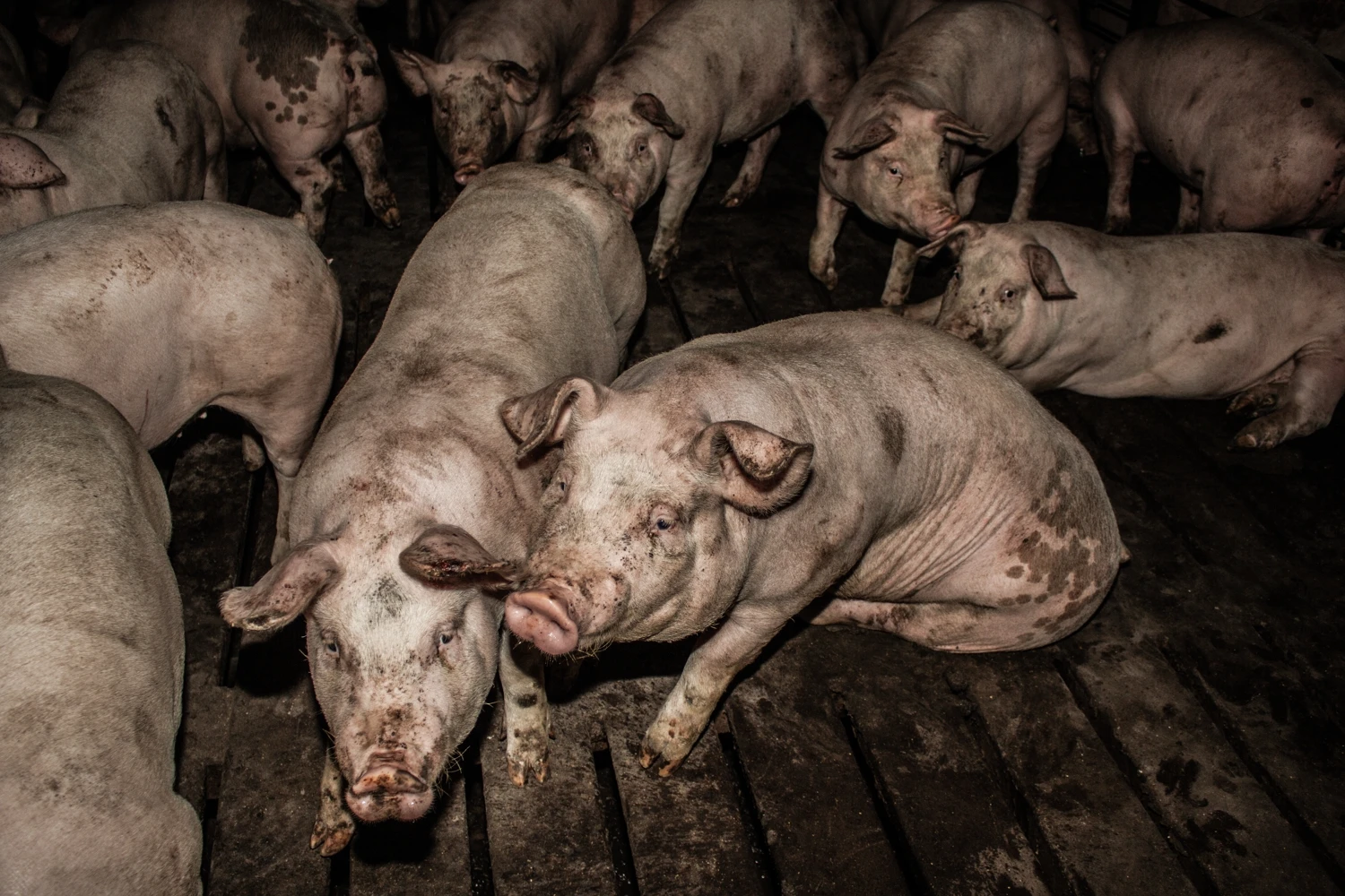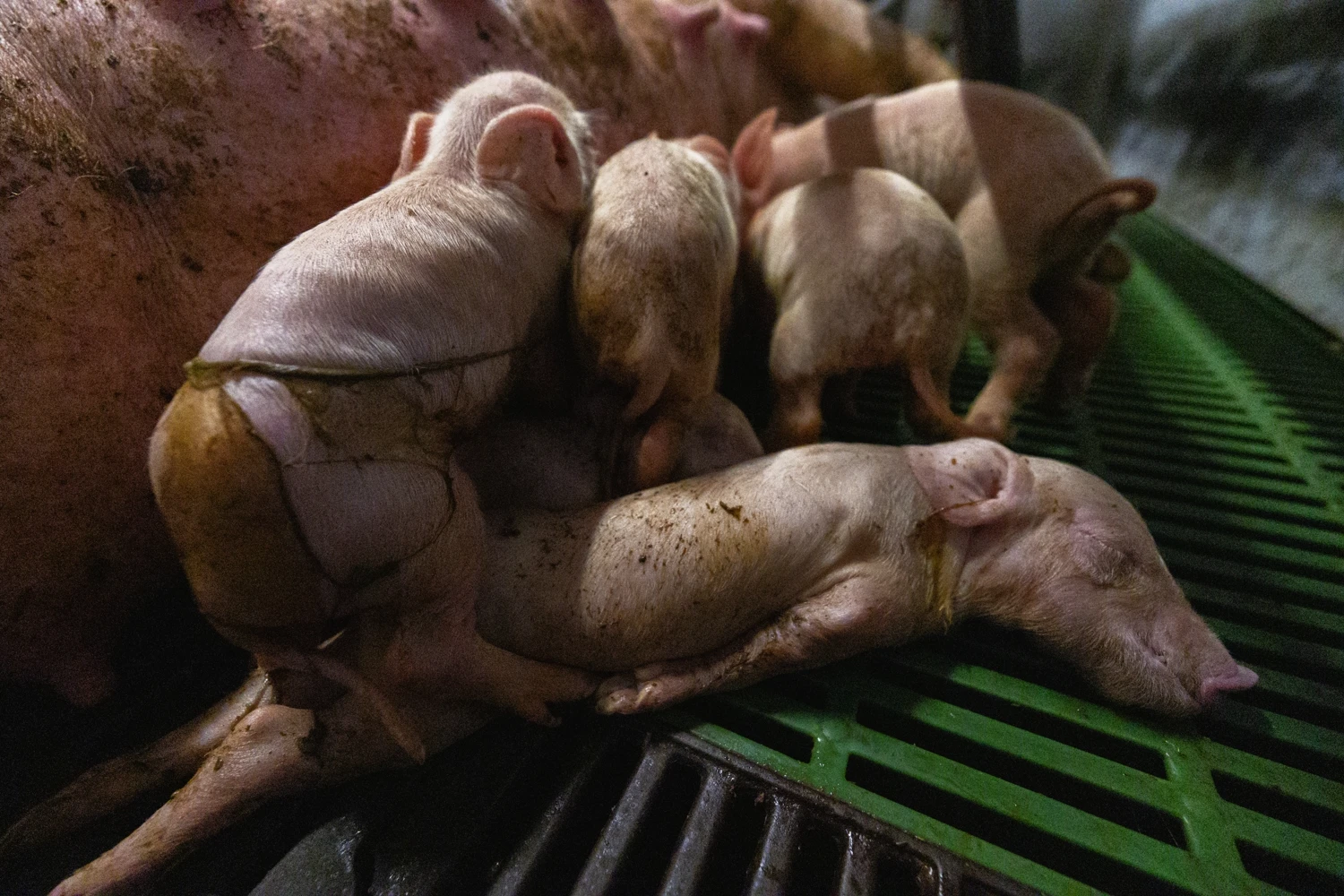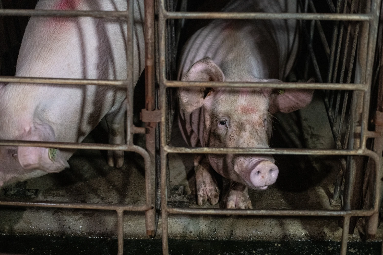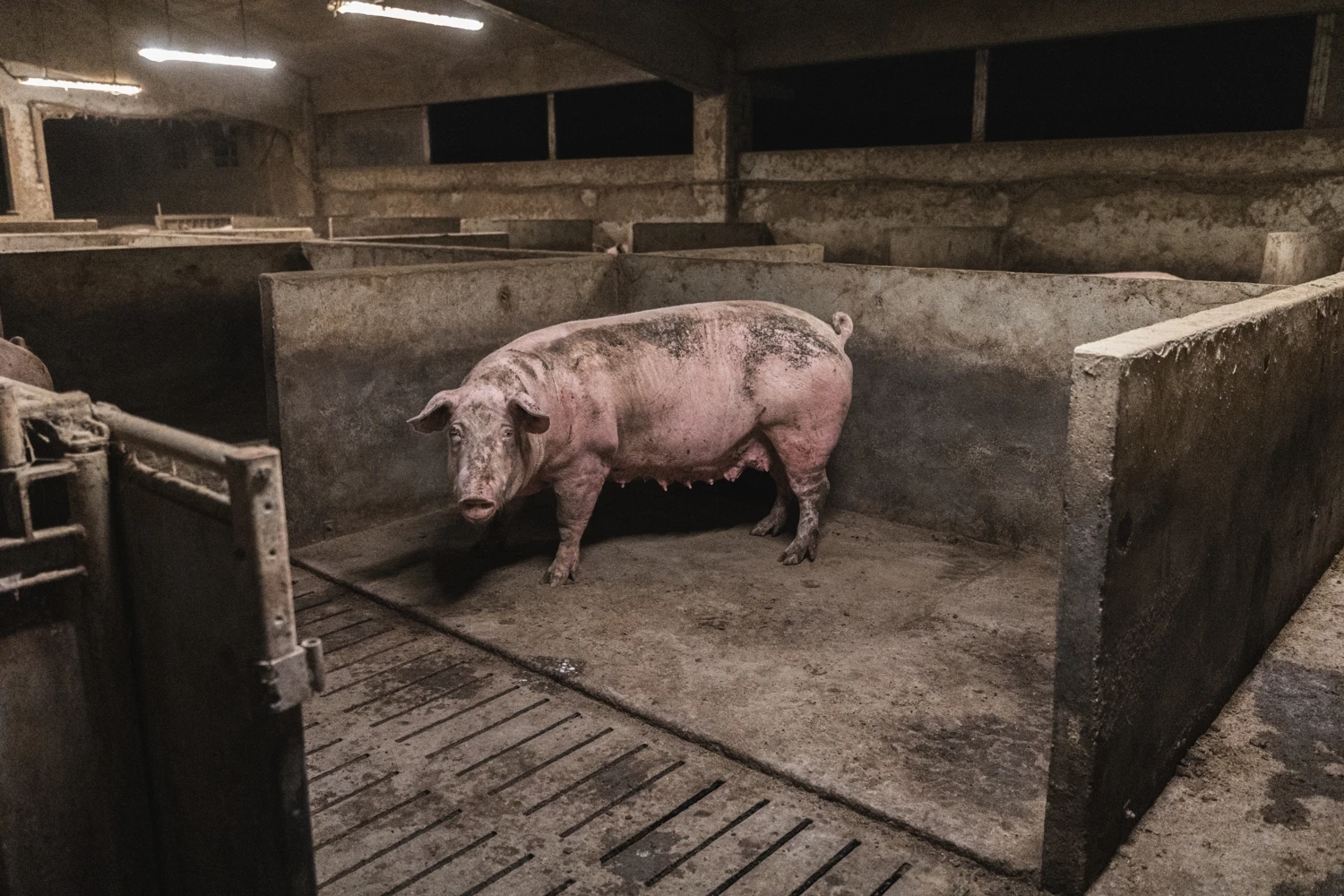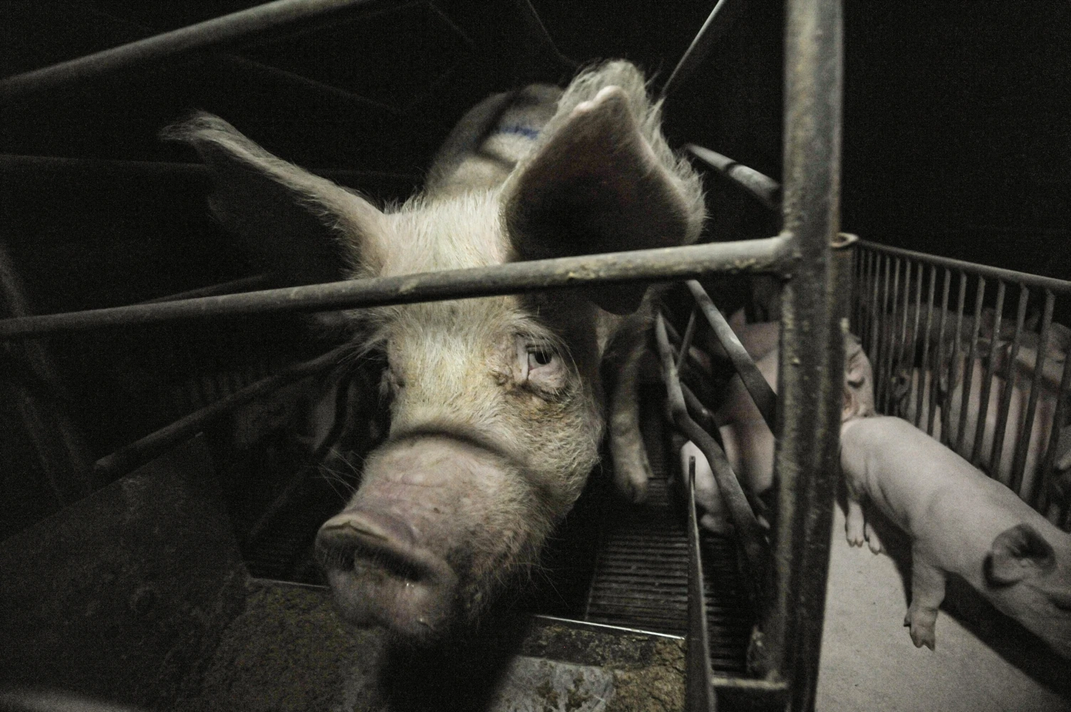 A grande maioria dos porcos criados para consumo humano vive confinada desde o nascimento até o momento do abate. Segundo a FAO, mais de 50% dos porcos abatidos no mundo têm origem em sistemas de criação industrial. Nessas fazendas, os animais passam os primeiros meses de vida em pé ou dormindo sobre superfícies de tela de arame, que ferem seus pés e pernas — ferimentos que quase nunca são tratados.