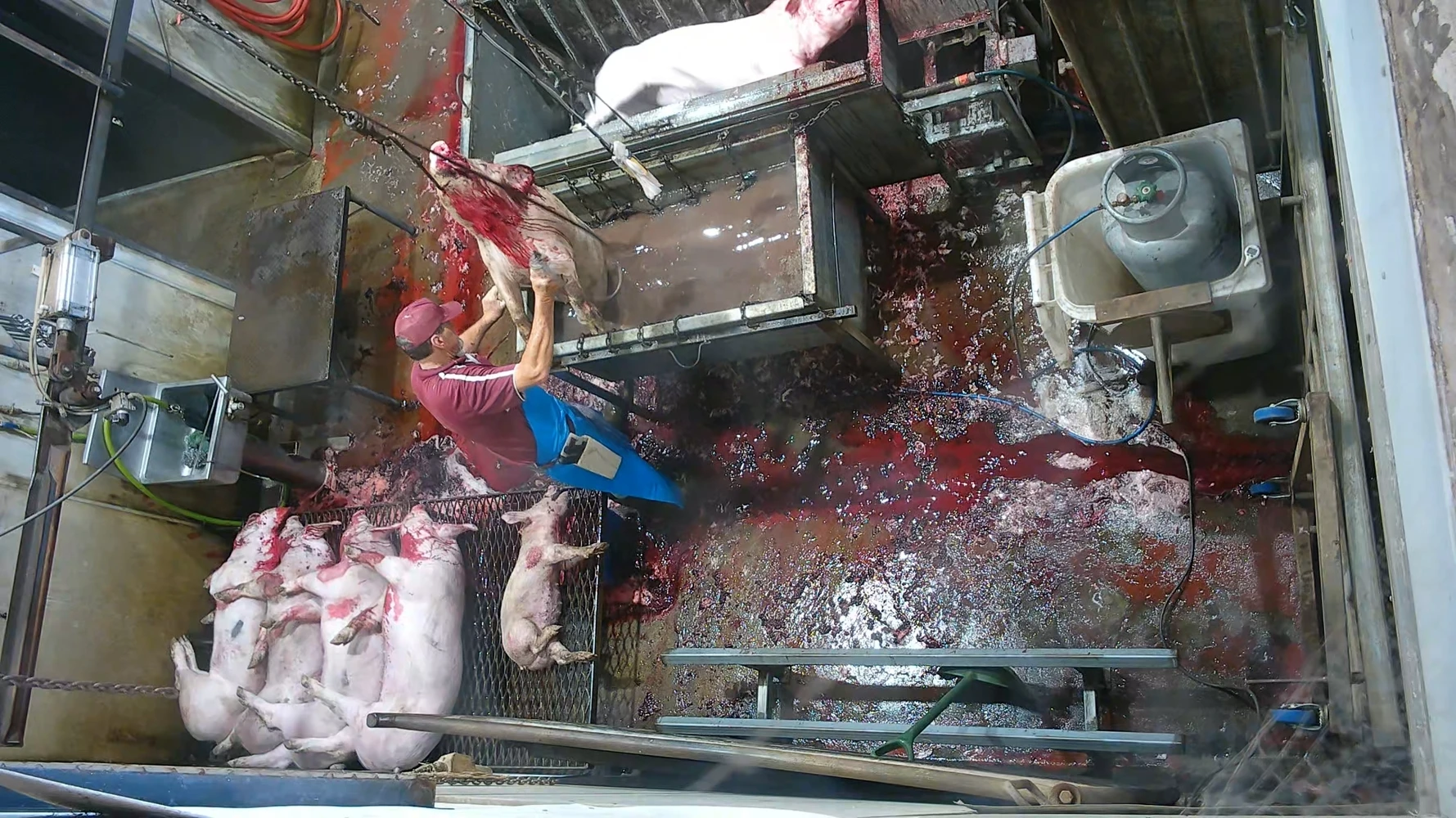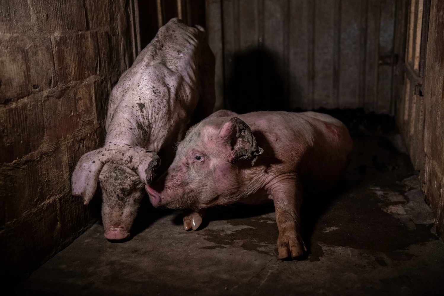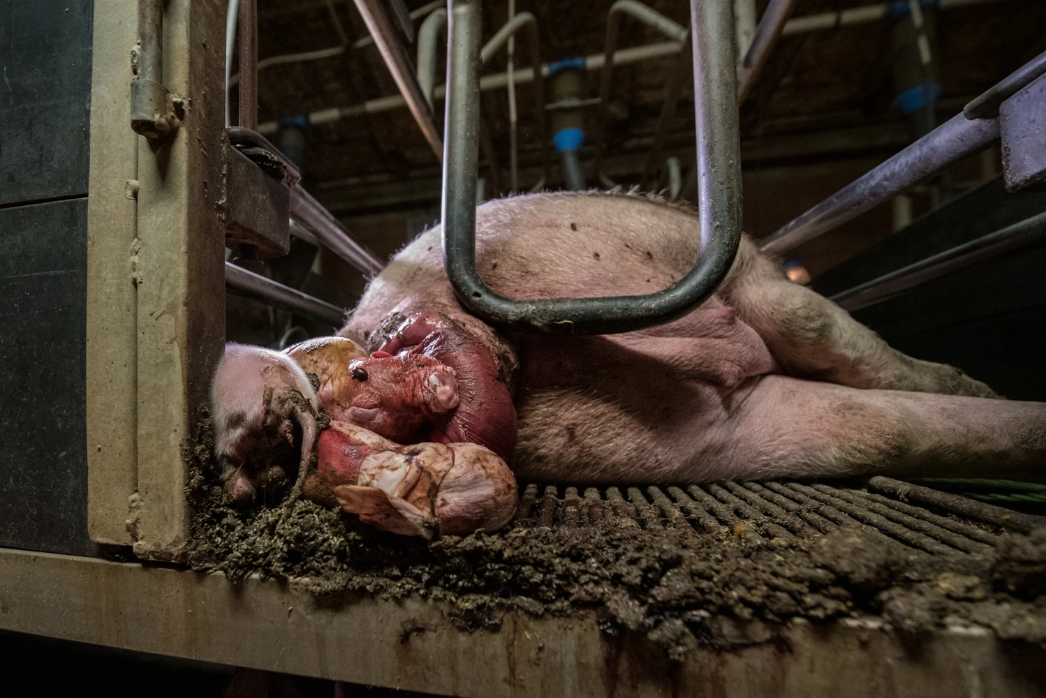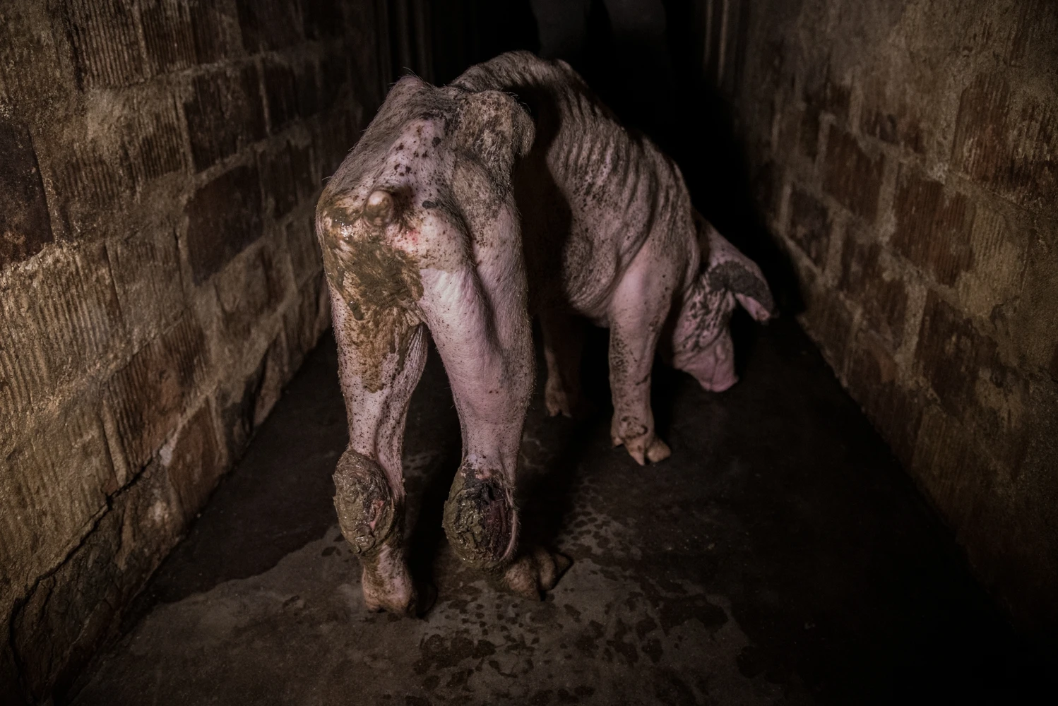 A grande maioria dos porcos criados para consumo humano vive confinada desde o nascimento até o momento do abate. Segundo a FAO, mais de 50% dos porcos abatidos no mundo têm origem em sistemas de criação industrial. Nessas fazendas, os animais passam os primeiros meses de vida em pé ou dormindo sobre superfícies de tela de arame, que ferem seus pés e pernas — ferimentos que quase nunca são tratados.