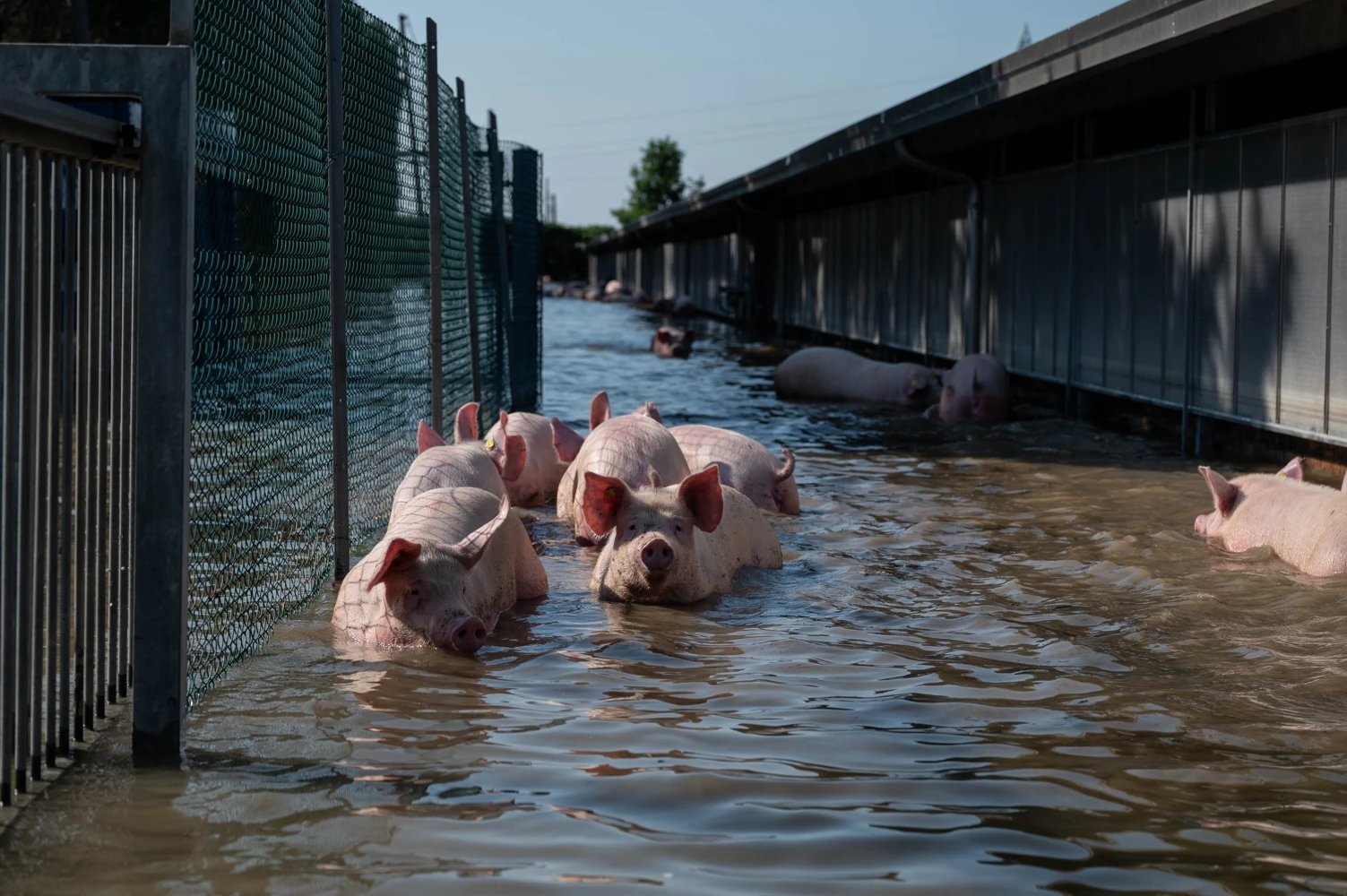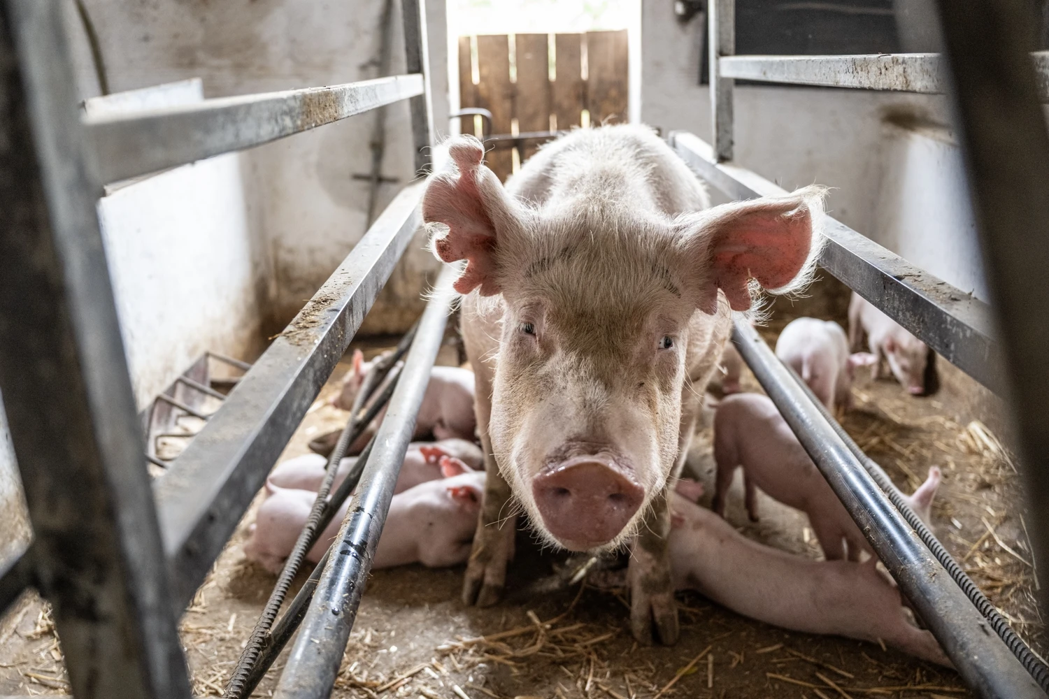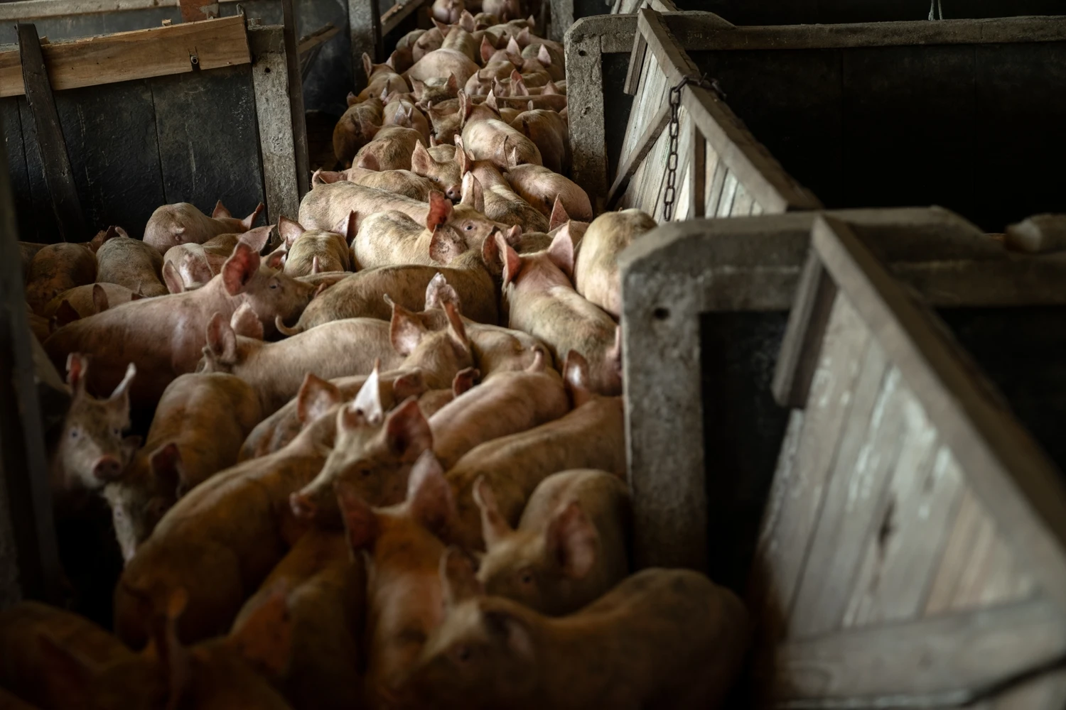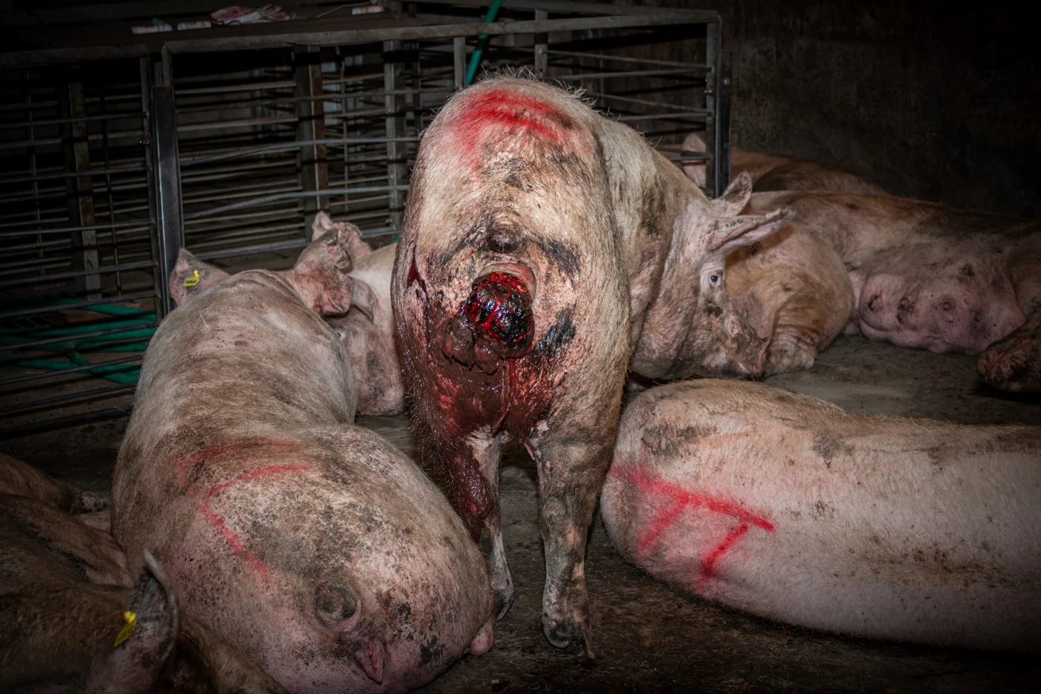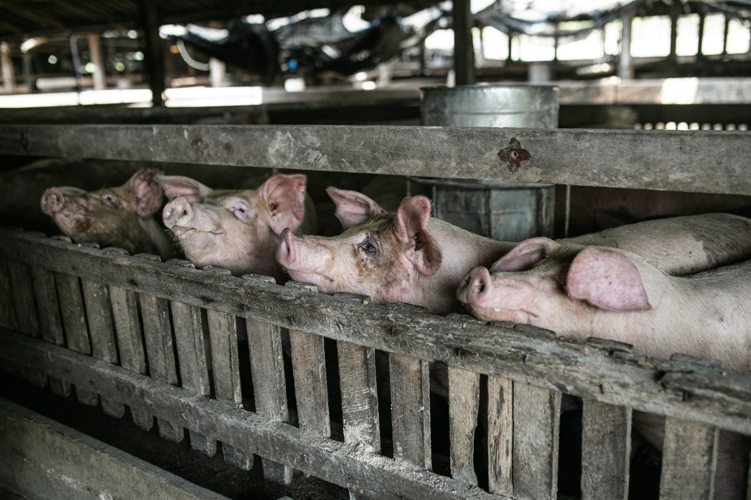 A grande maioria dos porcos criados para consumo humano vive confinada desde o nascimento até o momento do abate. Segundo a FAO, mais de 50% dos porcos abatidos no mundo têm origem em sistemas de criação industrial. Nessas fazendas, os animais passam os primeiros meses de vida em pé ou dormindo sobre superfícies de tela de arame, que ferem seus pés e pernas — ferimentos que quase nunca são tratados.