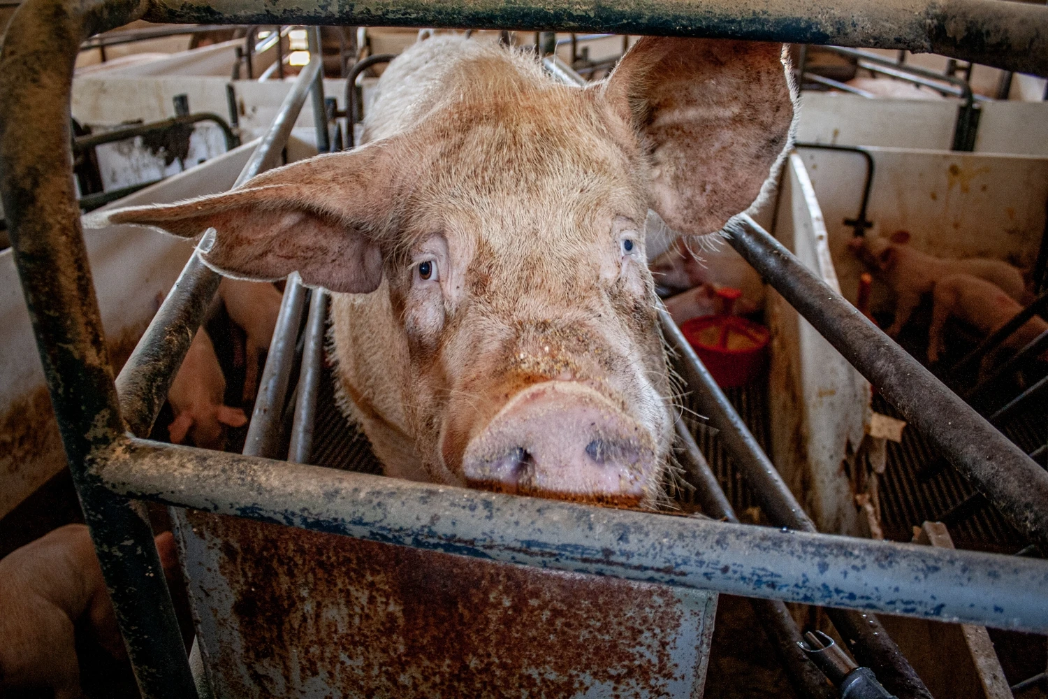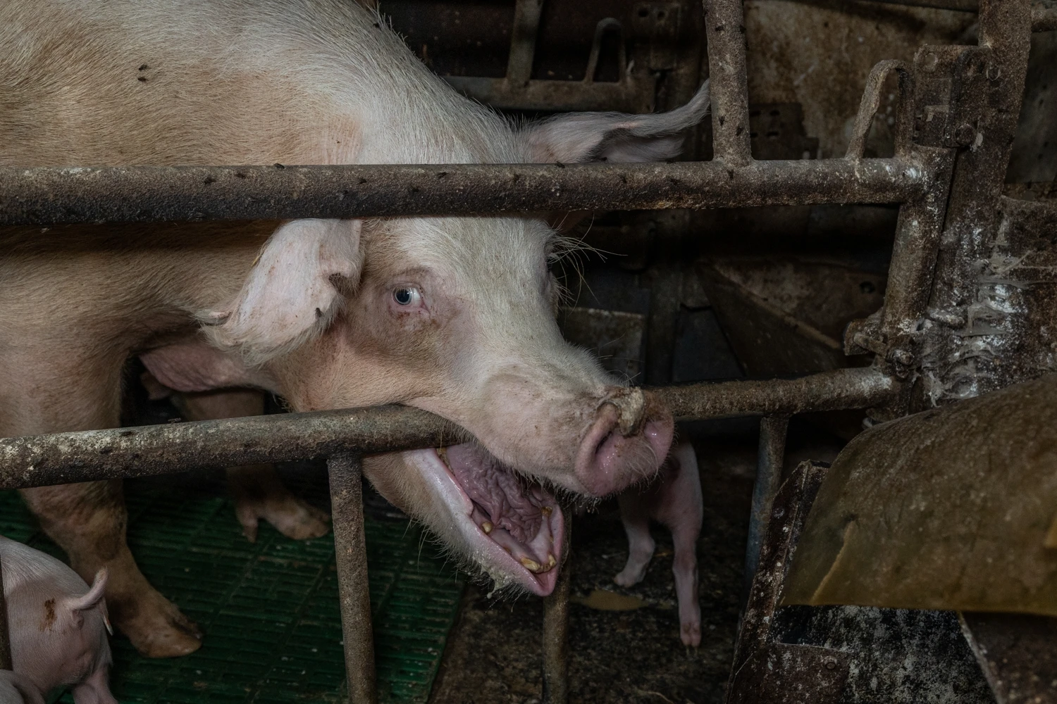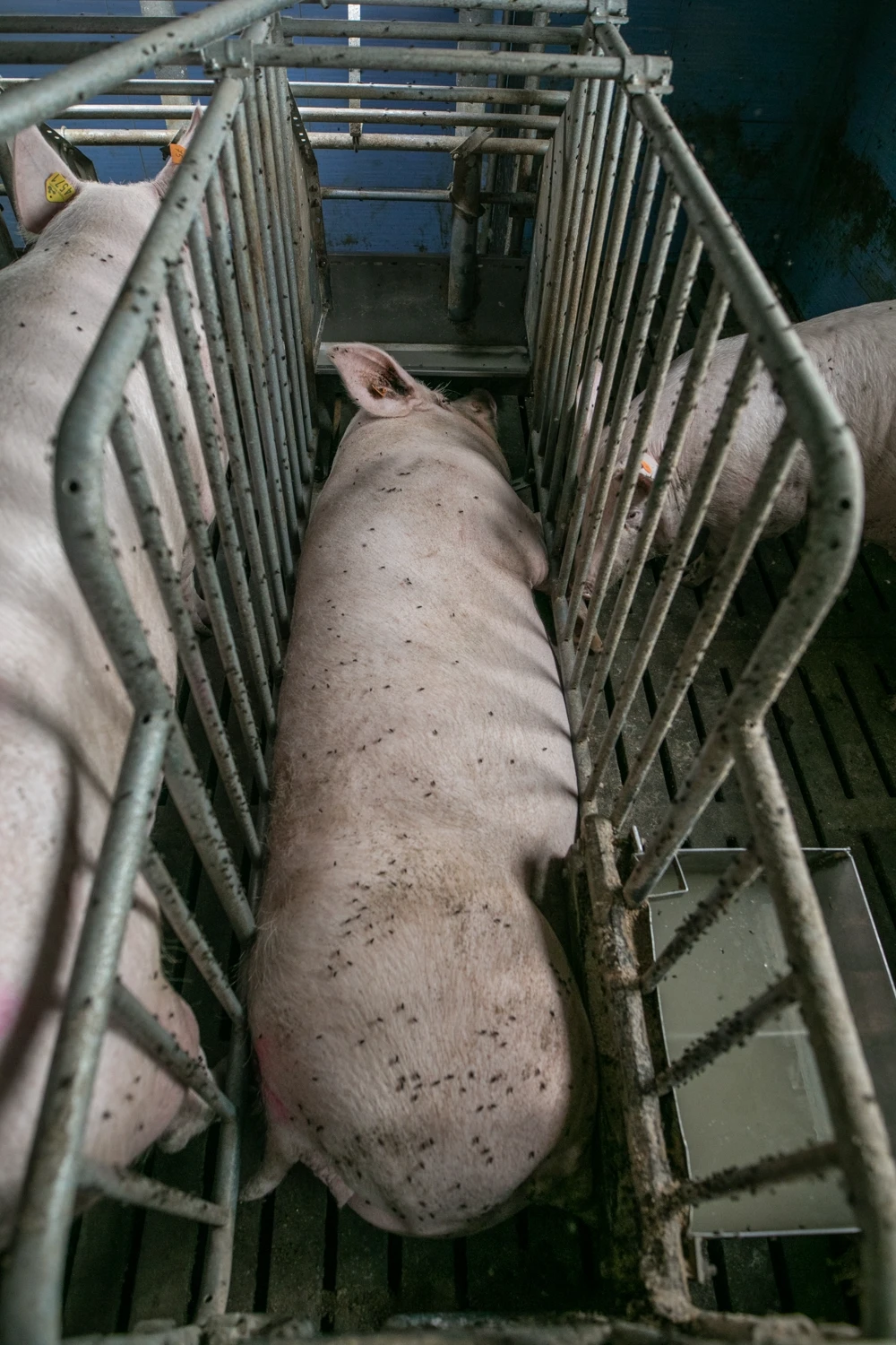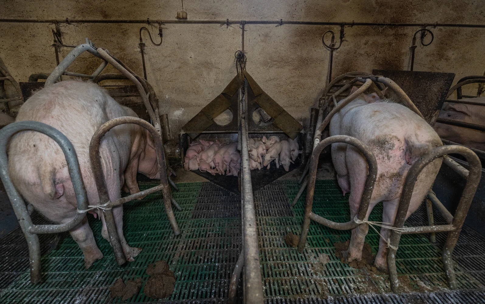 As porcas fêmeas, assim como as vacas leiteiras, estão entre os animais que mais sofrem na pecuária industrial. Assim que atingem a idade de reprodução, são emprenhadas e levadas para as chamadas baias de gestação — gaiolas de metal pouco maiores do que o tamanho de seus próprios corpos, que as impedem de dar um único passo para frente ou para trás, ou mesmo de girar sobre si mesmas. O único movimento possível é deitar-se ou levantar-se, e ainda assim de forma dolorosa, já que a largura das baias não permite que estiquem as pernas sem atingir a porca ao lado. Muitas acabam deitando-se sobre os próprios membros inferiores, o que causa dores intensas e feridas nessa região.