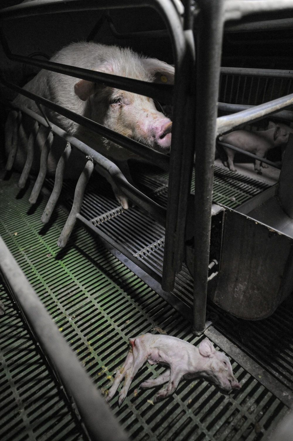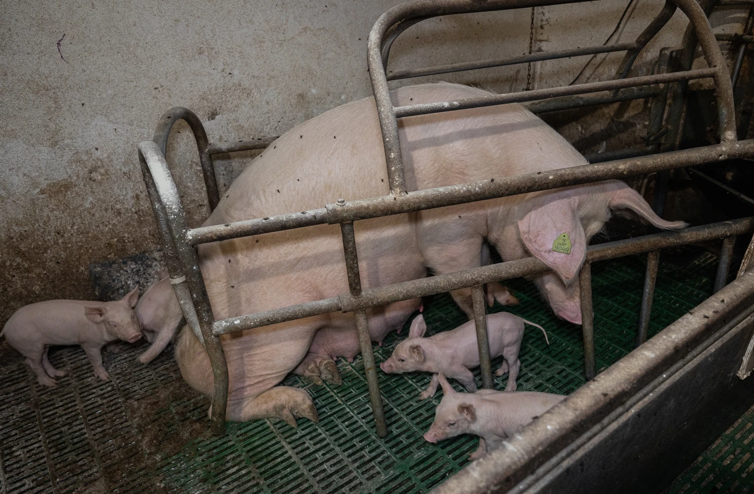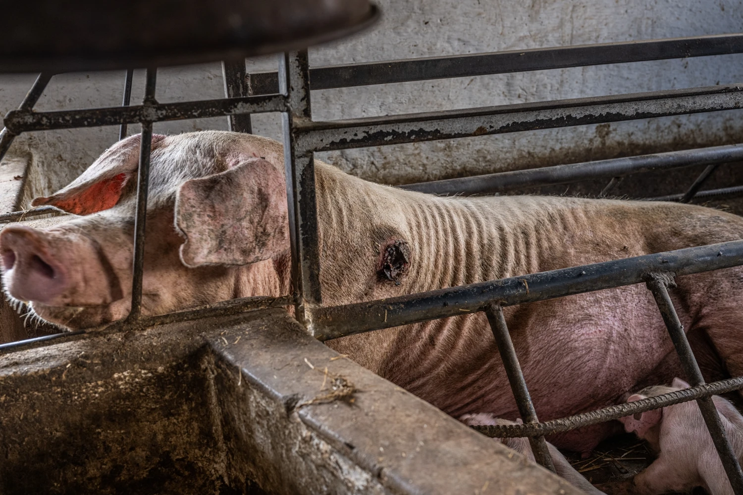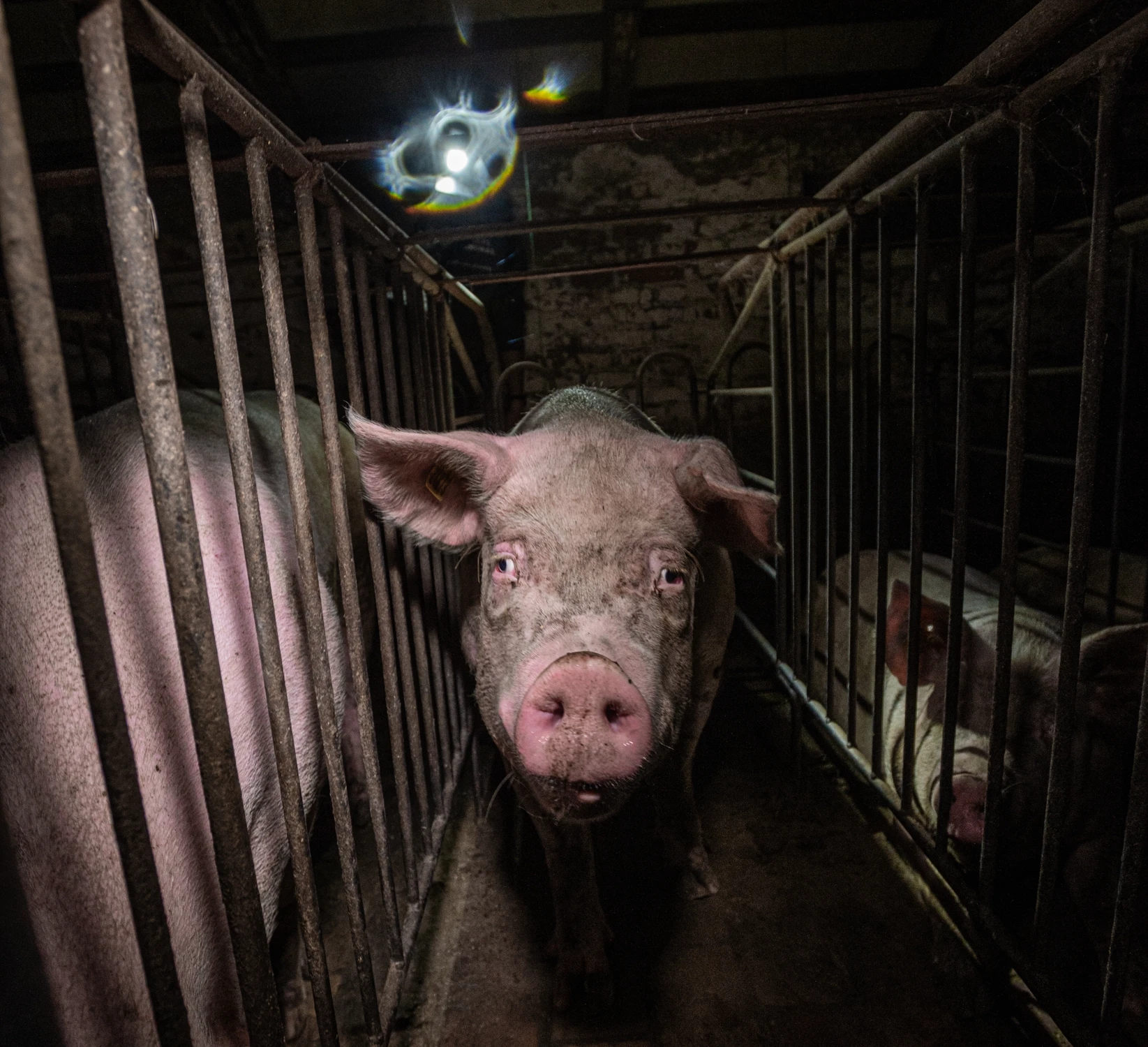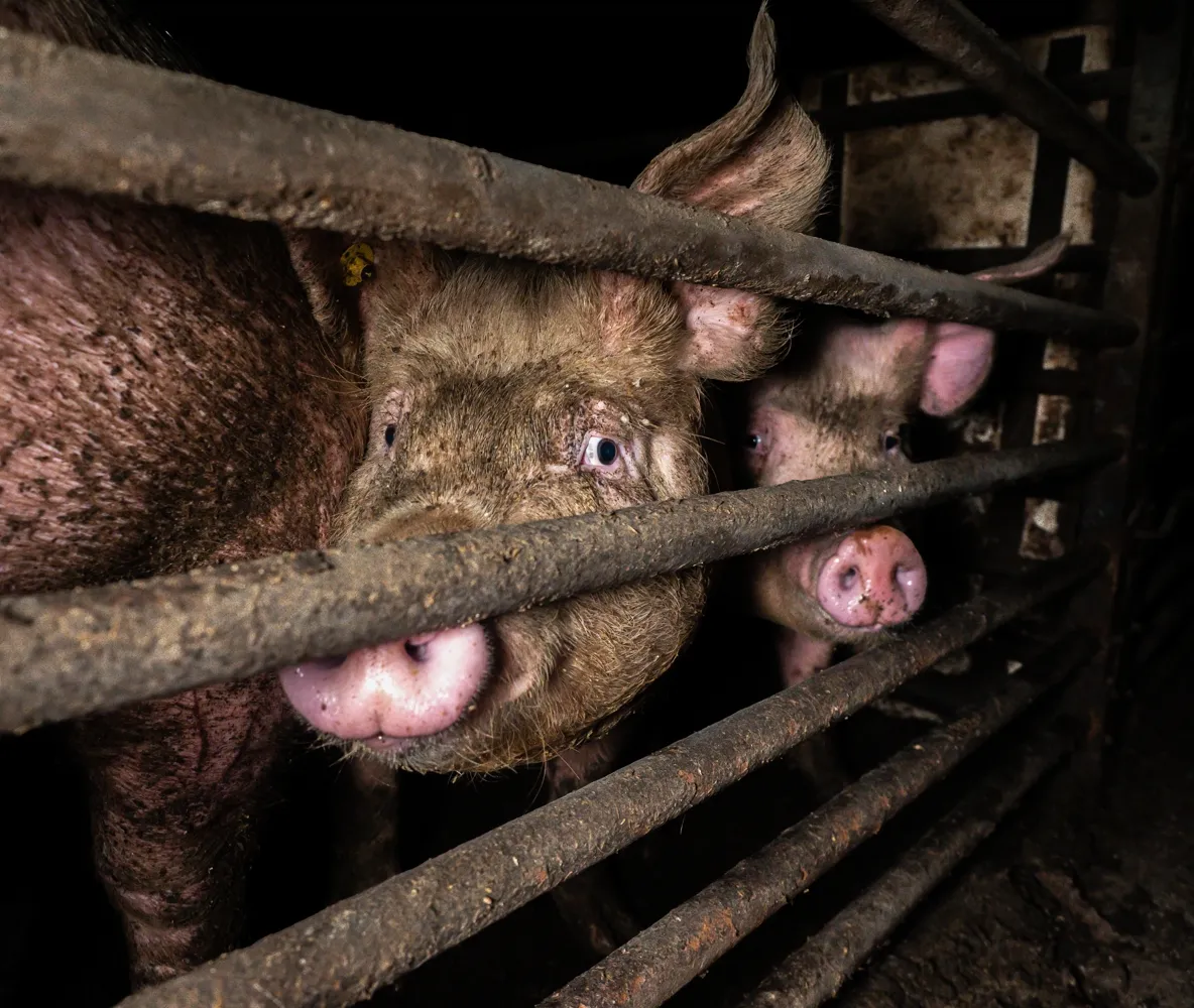 As porcas fêmeas, assim como as vacas leiteiras, estão entre os animais que mais sofrem na pecuária industrial. Assim que atingem a idade de reprodução, são emprenhadas e levadas para as chamadas baias de gestação — gaiolas de metal pouco maiores do que o tamanho de seus próprios corpos, que as impedem de dar um único passo para frente ou para trás, ou mesmo de girar sobre si mesmas. O único movimento possível é deitar-se ou levantar-se, e ainda assim de forma dolorosa, já que a largura das baias não permite que estiquem as pernas sem atingir a porca ao lado. Muitas acabam deitando-se sobre os próprios membros inferiores, o que causa dores intensas e feridas nessa região.
